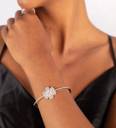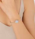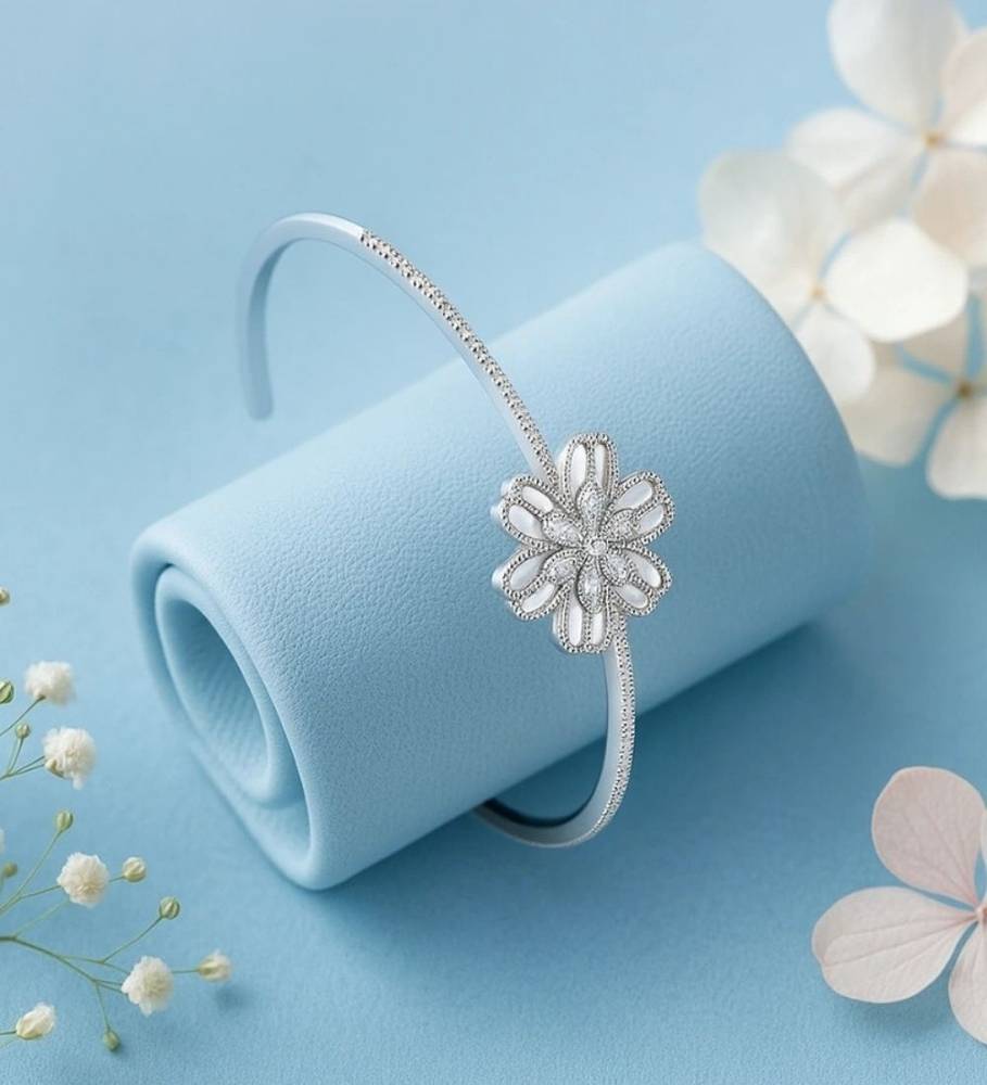 Elegant floral centerpiece with flexible bracelet band. Expertly crafted in 925 Sterling Silver, this bracelet features a radiant floral-inspired motif at the center, adorned with shimmering cubic zirconia. The sleek, flexible design is accentuated with pavé-set zircon stones along the band, ensuring a refined yet eye-catching finish that transitions seamlessly from daywear to evening glamour.