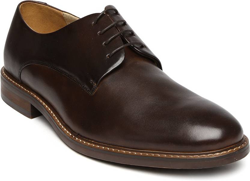 A pair of brown Derby formal shoes with central lace-ups. Leather upper. Cushioned footbed. Textured and patterned rubber outsole with a stacked heel. Warranty: 3 months against manufacturing defects. Dress to impress with this pair of semiformal slip-ons from Steve Madden. Team it with slim fit trousers, a crisp shirt and a blazer to work a statement style.