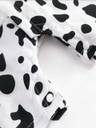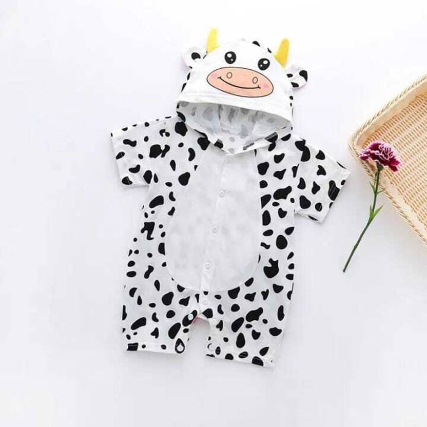 Crafted with high-quality, soft, and breathable fabric, this romper set ensures maximum comfort for your baby girl. The main body of the romper is adorned with playful black and white cow spots, creating a fun and whimsical look. The front features an endearing embroidered character face with yellow horns, a smiling expression, and a red bow on the hood, adding an extra touch of charm and cuteness. The hood also provides additional warmth, making it perfect for chilly days.