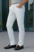 Sleek and Modern – Slim white jeans offer a refined silhouette that’s both contemporary and comfortable. Typically cut with a slim thigh tapering to the ankle and a mid-rise waist, they create a sharp, tailored look that’s suitable for both casual weekends and smart-casual settings
