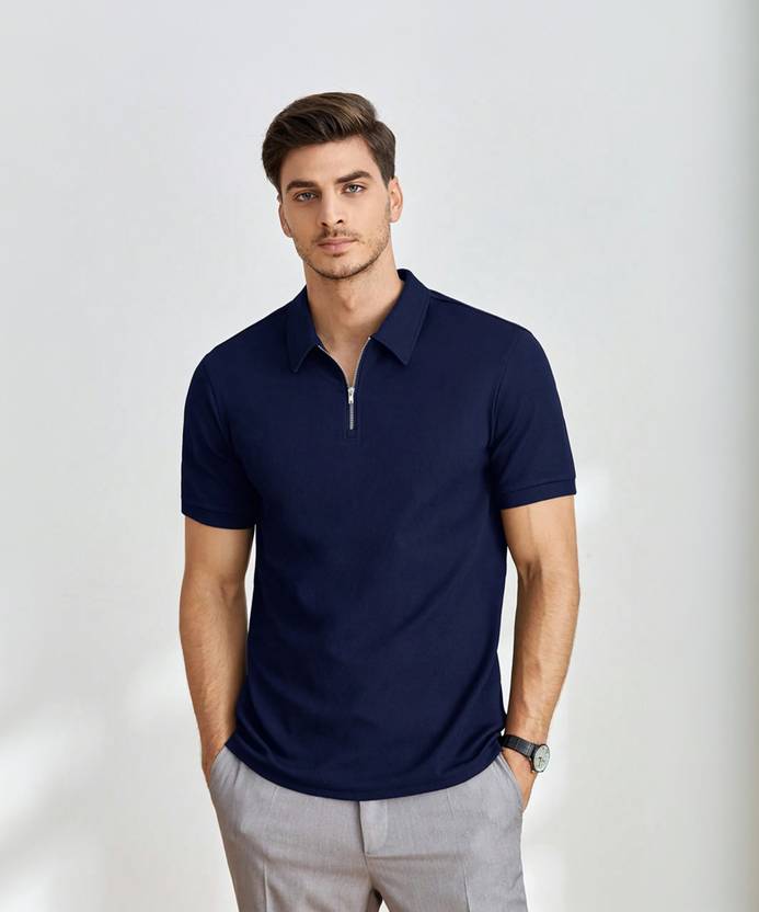 Stockton Solid Men Polo Neck Navy Blue T-Shirt