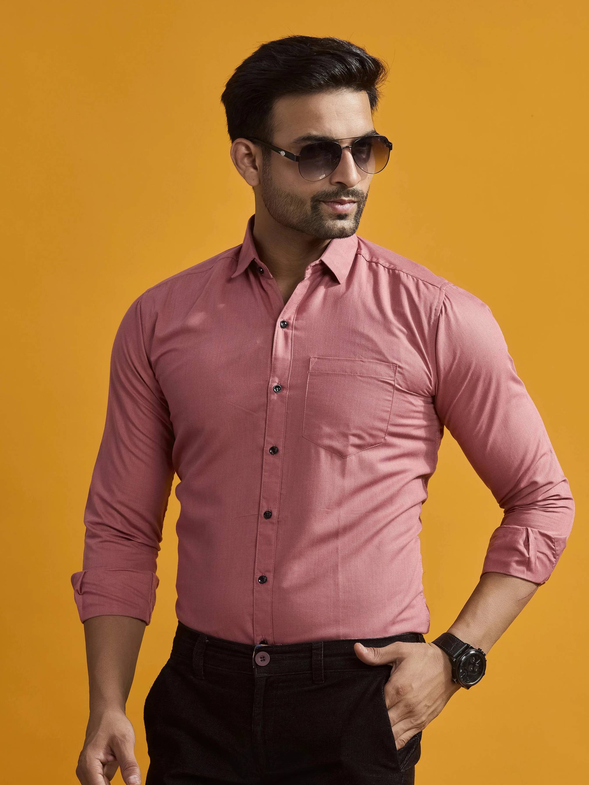 Pull off an effortlessly stylish look when you don this ultra-trendy solid colour shirt. Team it with chinos and round-shaped sunglasses to complete your look.