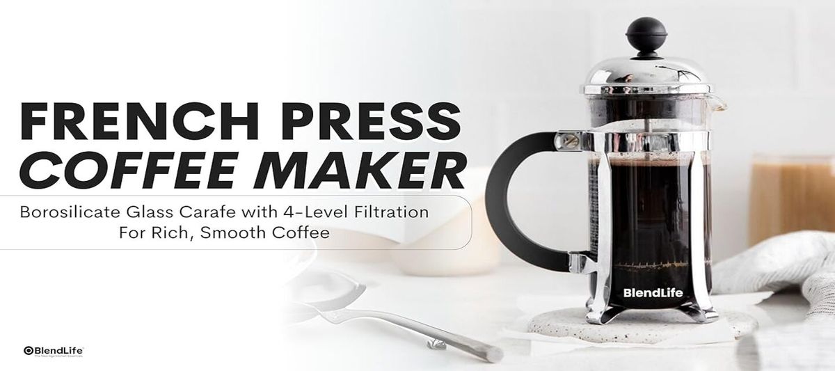 BlendLife French Press Coffee & Tea Maker, 4-Level Filtration System, Glass Carafe - 600ml 2 Cups Coffee Maker