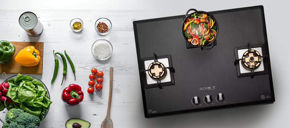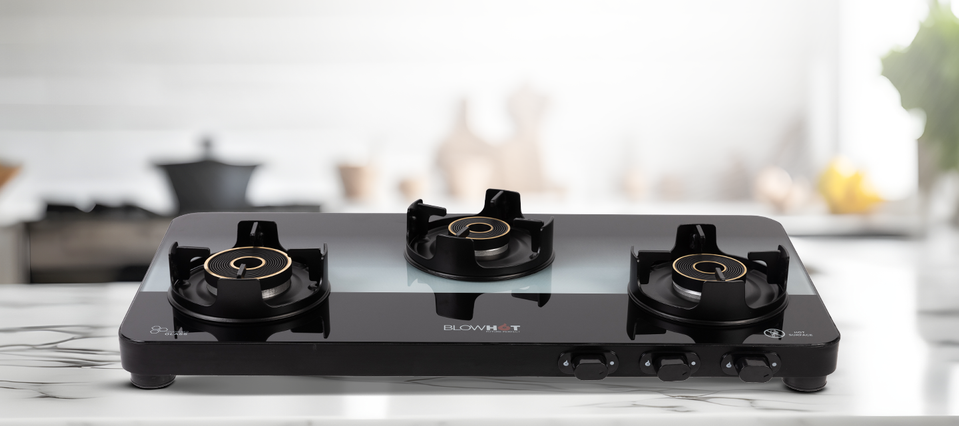 BLOWHOT Sapphire 3 Tornado Brass 5G Burners, 5-Year Warranty, Premium Design, Toughened Glass, Aluminium Manual Gas Stove