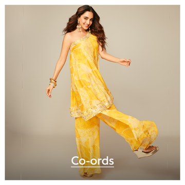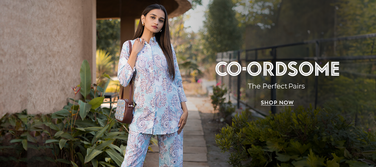 - Co- ordsome: This collection features outfits with matching aesthetics that create a sophisticated visual harmony. The different tops have eye-catching neck and sleeve designs. Additionally, diverse bottom wear options, like palazzos, further enhance the look.