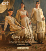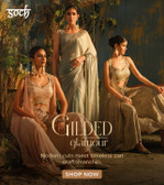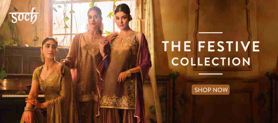 Gilded Glamour: This collection of Soch is made of luxurious fabrics, creating a stunning appearance. They often have intricate zari work to offer a regal touch. The old-school charm of these garments fits in well with celebratory occasions.