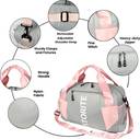 1 Main compartment + 1 small wet pocket + 2 inside Card pocket + 1 Shoe Compartment & front zipper & Side mesh Pocket., Two short handles + 1 Shoulder strap handle., The travel bag is made from Nylon fabric which is water resistance material keeps your stuff dry inside.