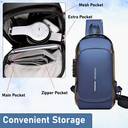 Anti-Theft Lock: The robust dual-access zippers with a combination lock design ensure both ease of access and enhanced security, providing you with a private space. Additionally, a concealed anti-theft pocket at the back keeps your valuable items safe from thieves., USB Port Design: Featuring an integrated USB charger on the exterior and a built-in charging cable inside, this chest bag provides a more convenient way to charge your phone while on the move.