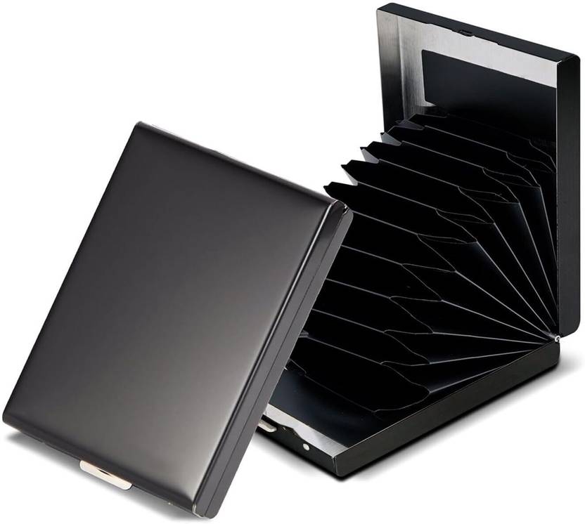 Brand: Storite Color: Shiny Black Dimensions: Fits perfectly in your pocket (9.5x 6.6 x 1.9 CM.) Material: Stainless steel Product 10 Slot vertical Metal Card Holder-Black Stores 10 Debit/Credit Bank Atm Cards. Easy Click Button For Opening And Closing, Latches Safely And Securely When Not In Use. The slim, thin, and compact ID case fits into your front pocket, making it perfect for traveling with essentials. The look and feel of your business will help you make a good first impression on your customers, colleagues and entrepreneurs. Easy to open and close. It can be latched safely and reliably when not in use. The rounded corners will not damage your clothes. With 10 accordion slots, it can hold more credit cards.