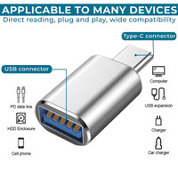 Courtesy of its wide compatibility, this OTG adaptor applies to a vast array of devices. If you're using it with a USB connector, PD data line, HDD enclosure, or your cell phone, it provides direct reading and seamless plug and play functionality. This means you can connect it to your Type-C port connector on your computer, use it for USB expansion, or even plug it into a car charger without any hassle.