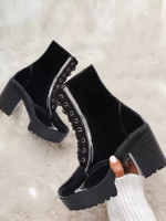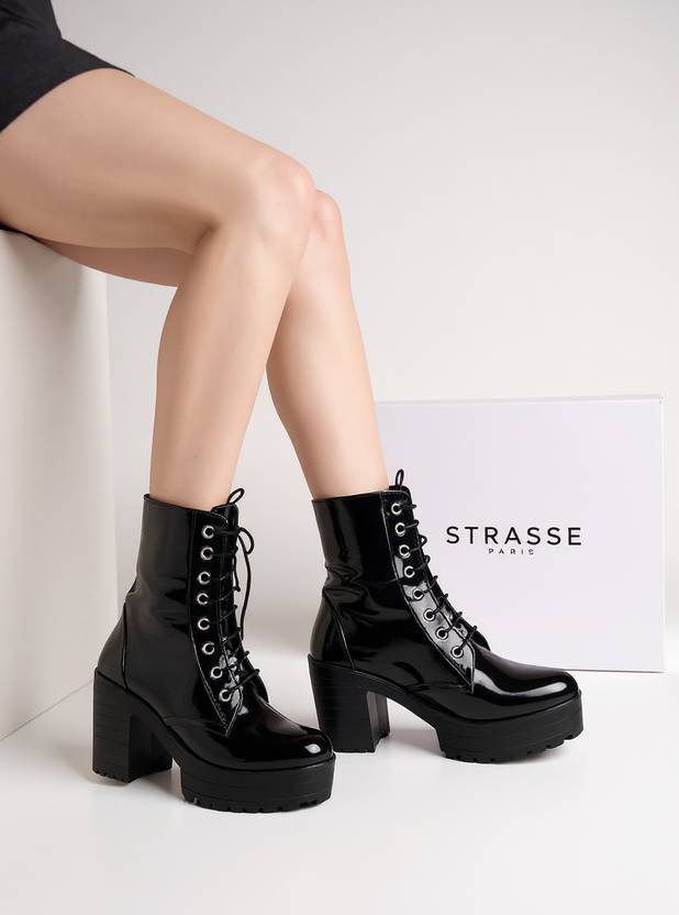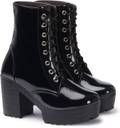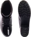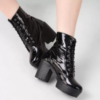 These boots are crafted from high-quality patent leather, which provides a sleek, glossy finish that adds a touch of elegance to any outfit. Patent leather is not only stylish but also durable and resistant to scuffs and scratches, ensuring your boots remain looking new for a long time. The smooth surface is easy to clean and maintain, making these boots a practical choice for everyday wear.