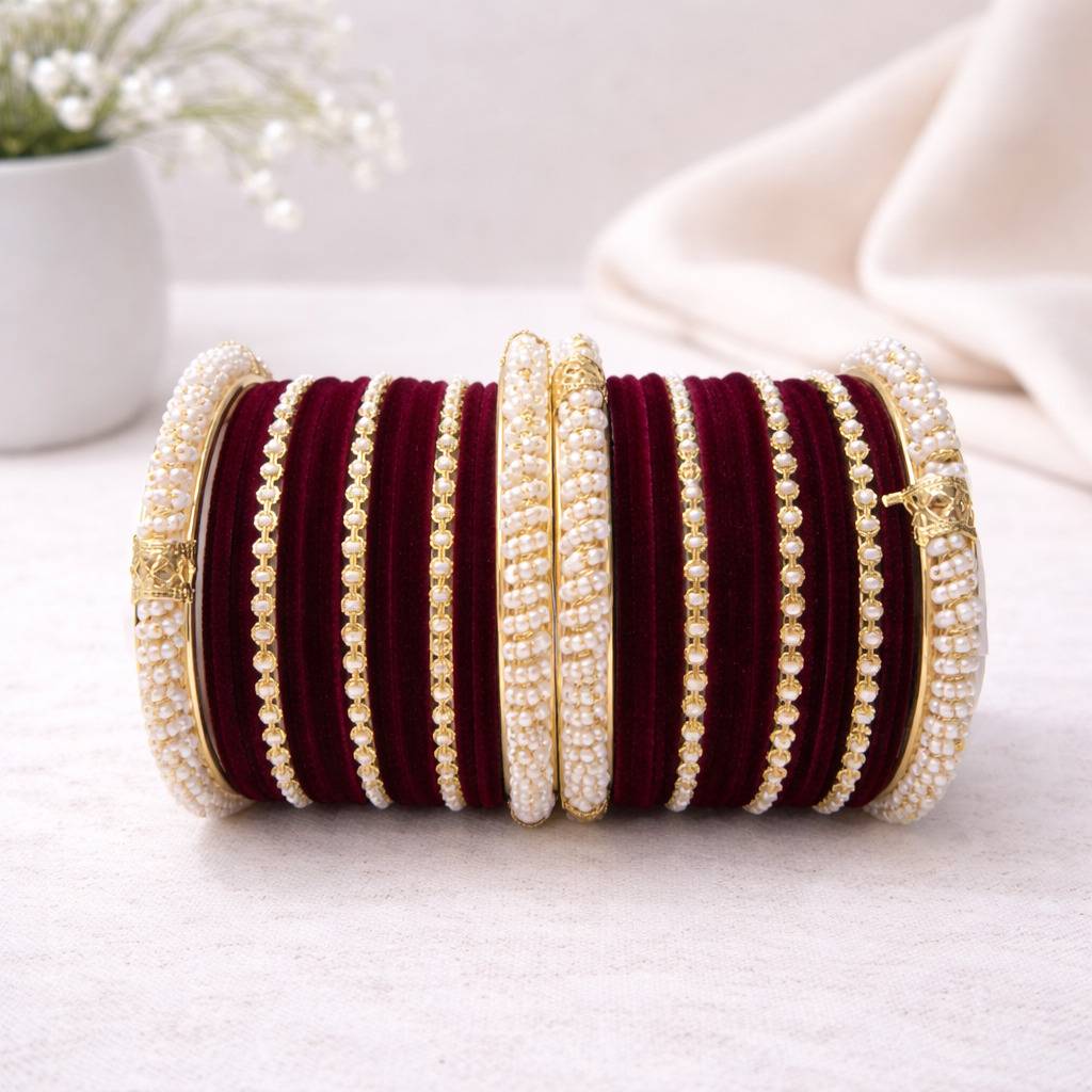 Crafted with attention to detail, each bangle showcases smooth velvet finishing for a royal look and comfortable wear. The combination of maroon velvet, pearl beads, and gold-toned accents offers a perfect balance of tradition and style. This chooda set complements bridal and ethnic outfits, enhancing the overall appearance with a graceful charm.