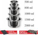 Add shine and style to your Kitchen with this Magnificent 5 Pcs Stainless Steel Induction & Gas Stove Friendly, Heavy Gauge Tope / Cookware Set With Lids from FC Features: « Induction Friendly Cookware « Will work on Gas stove also « Heavy Gauge. Good Quality. Made with high quality stainless steel. « Flat Bottom « Energy Efficient, heats evenly and cooks faster « Easy to clean « Set contains collection of tope / vessels of various sizes, hence taking care of all your kitchen needs « Compaq size makes it easy to store in kitchen cupboards. When not in use, stack the smaller container inside bigger containers saving storage space. Specifications: Material: Export Quality Heavy Gauge Stainless Steel making it ideal for daily use, highly durable & long lasting. Capacity: Tope No. 10 - 1L , Tope No. 11 - 1.5L , Tope No. 12 - 2L , Tope No.13 - 2.5L , Tope No. 14 - 3.