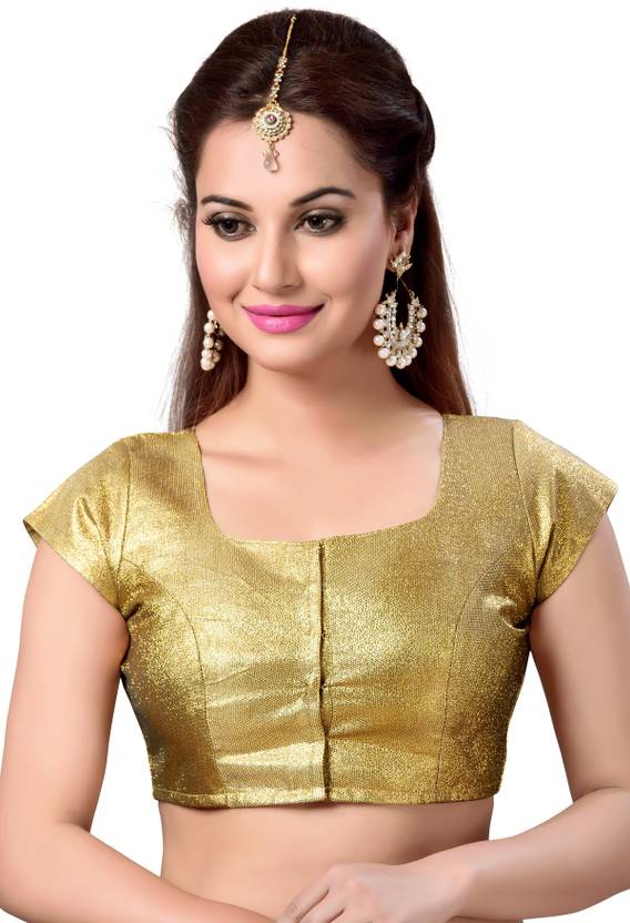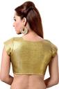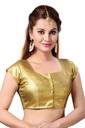 A rich golden blouse with high back and short sleeves. This blouse opens from front . The back is fully covered and hence ideal for ladies who do not wish to expose the back.