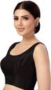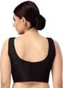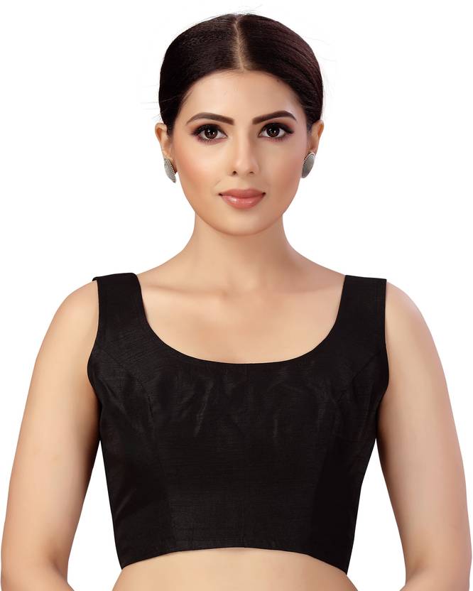 This smart saree blouse is sleevelss and is available in many colours .The neck is round in shape and is lined with a soft fabric.The fabric is a very soft polyester silk with a very smooth and silky feel .This blouse is available in many colours and sizes from 34 to 42.It opens from the back with hook and eye.It can be teamed with a lot of sarees.