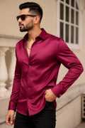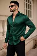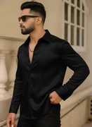 This is a men's elegant white full-sleeve shirt, crafted from a smooth, lustrous fabric, likely satin or a similar blend, giving it a sophisticated sheen. It features a classic collar, a full button-down front, and a stylish curved hemline. The shirt has a refined fit, suitable for various occasions. It pairs well with black trousers, dark-wash jeans, or chinos, and can be complemented with loafers or dress shoes.