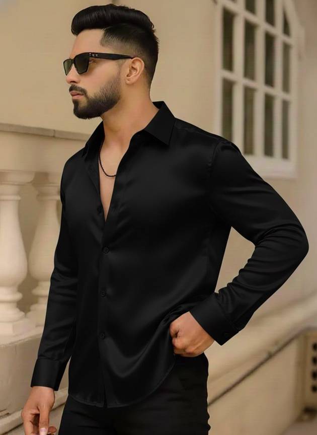 This is a sleek black full-sleeved shirt featuring a collared neck and a button-down front. Crafted from a smooth fabric with a distinct satin-like sheen, it offers a refined and modern look. The fit appears to be regular to slightly slim, providing a comfortable yet tailored silhouette. This versatile shirt can be paired with formal trousers, casual jeans, or chinos, and complemented with dress shoes or loafers for various occasions.