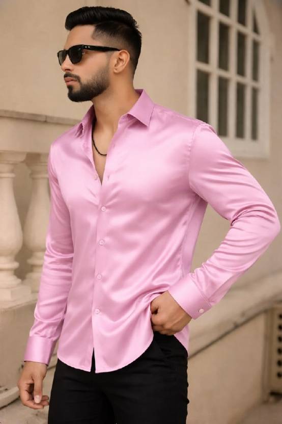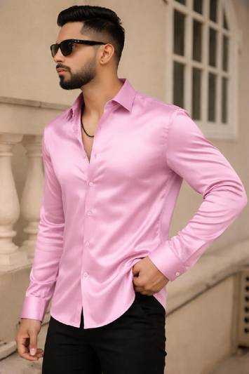This is a men's elegant white full-sleeve shirt, crafted from a smooth, lustrous fabric, likely satin or a similar blend, giving it a sophisticated sheen. It features a classic collar, a full button-down front, and a stylish curved hemline. The shirt has a refined fit, suitable for various occasions. It pairs well with black trousers, dark-wash jeans, or chinos, and can be complemented with loafers or dress shoes.