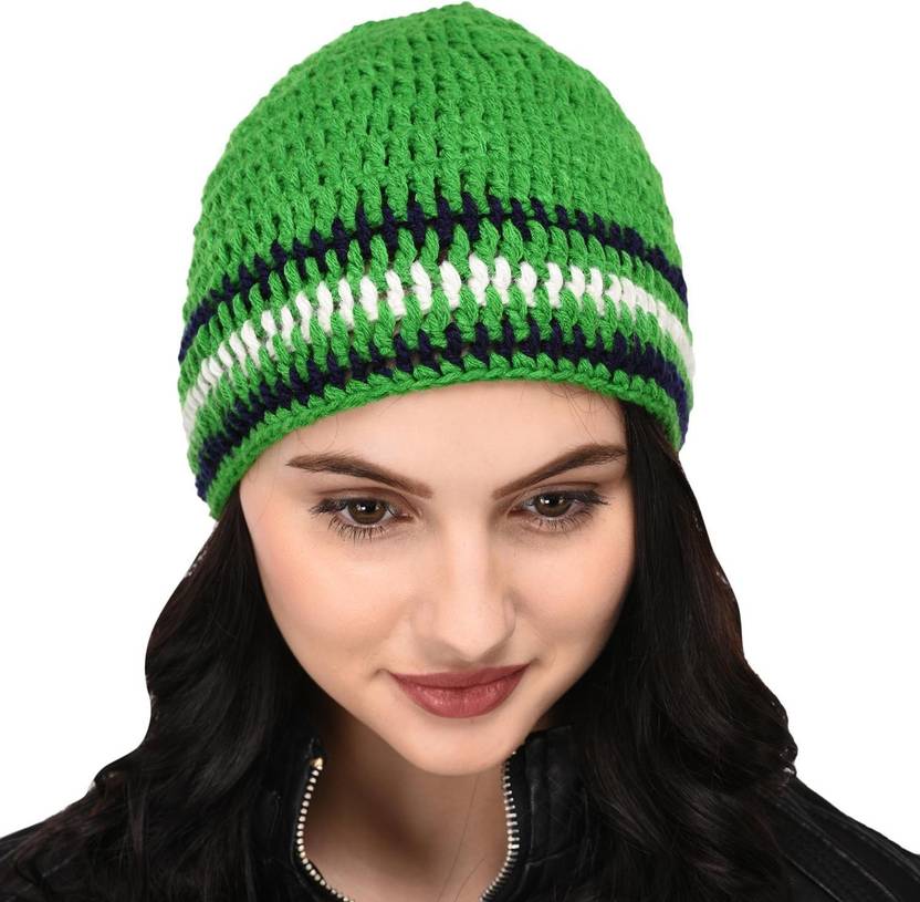 "Authentic handknitted in thick woolen yarns warm skull cap in green with multi color stripes pattern on the band, it is a perfect way to keep warm in the season. Constructed with soft wool, shape that fits so well. A perfect fashion accessory for winters, and a great style statement. 100 % hand knitted by local artisans of Uttrakhand, with constant design input and quality check from Stylebond are the sure signs of this collection. This knit that best fits an average adult and teen head. Disclaimer: Color may vary slightly due to photographic settings."