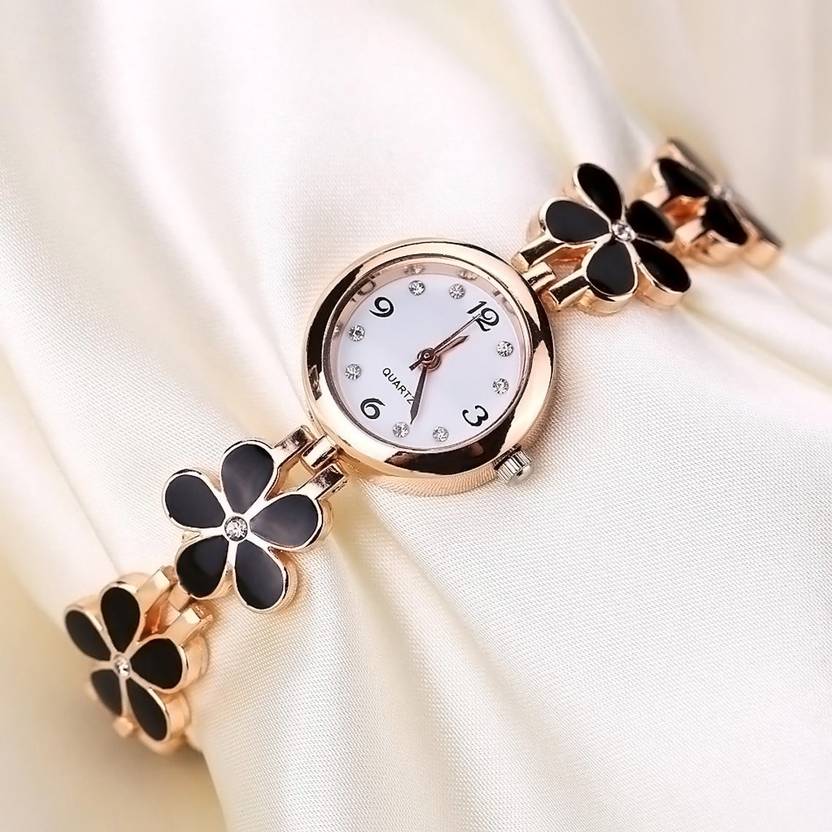 Bewitching look designer Bone White Dial With Floral Designed Midnight Black Colored Strap with Diamond Studded Bracelet Watch Straps Quartz Analog Girls Watch Ledis