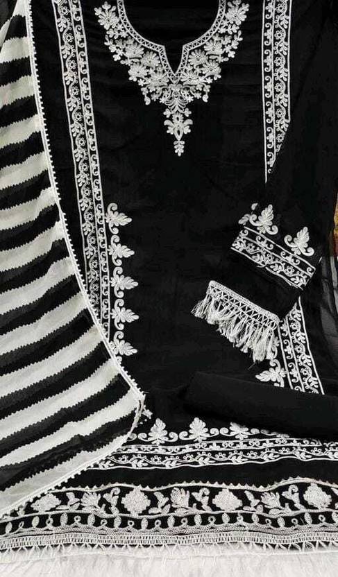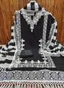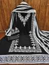 Georgette is a lightweight, semi-sheer, slightly crinkled fabric that flows beautifully, making it ideal for Pakistani unstitched suits. These suits usually come in three pieces: a georgette top (kameez) with detailed embroidery, a matching dupatta (often georgette or net), and a bottom made of santoon, crepe, or dull finish fabric.