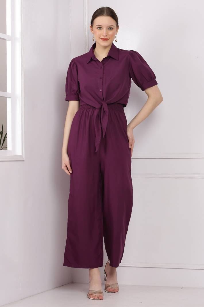 This vibrant mustard jumpsuit combines elegance and comfort for a chic, effortless look. The top features a collared shirt design with short, slightly puffed sleeves, giving it a smart, tailored appearance. The button-down front adds a classic touch, while the waist is defined by a fabric tie, accentuating the figure. The bottom half of the jumpsuit flows into wide-legged pants, offering ease of movement and a relaxed silhouette. The smocked detailing at the waist enhances the fit, making it both stylish and comfortable. Perfect for casual outings or semi-formal occasions, this jumpsuit blends sophistication with a bold color that stands out.