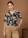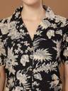 Black floral printed cotton crop top. Top has front button placket on it with shirt collar & short sleeves, Top Length- 20'' Inch. Wear it unbuttoned over a solid, neutral white or black t-shirt or tank top for a light jacket look.