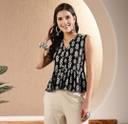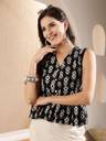 Black Ikat printed V- neck peplum top. Front Functional Placket with shell button. Sleeve less top with belt detailing on waist. Top length - 20'', Casula wear top.