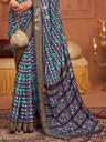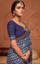 Navy Blue ikat print tussar silk saree. Elegant partywear saree with golden foil border. It has unstitch blouse. Saree Length - 5.50 Mtr, Blouse Fabric Length - 0.80 Mtr
