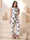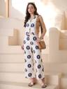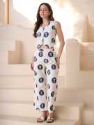 Blue & off white cotton flex floral printed top. Top has front button placket on it with u-neck and Seeveless. Printed cotton flex pant with fully ilasticated belt. Top Length- 22" Inch, Inch Pant Pant Length- 38'' Inch