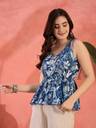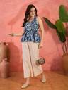 Blue tropical printed v-neck and shoulder tie-ups co-ord set. Comfy soft cotton mul fabric for summers. Top has tassles on it. Cotton blend solid pant. Top Length- 25'' Inch, Short Length- 38'' Inch.