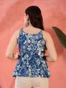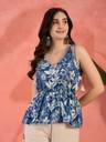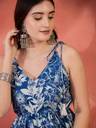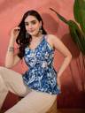 Blue tropical printed v-neck and shoulder tie-ups co-ord set. Comfy soft cotton mul fabric for summers. Top has tassles on it. Cotton blend solid pant