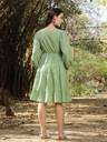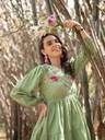 Solid pista green embroidered midi dress. Dress has round neck and long puffed sleeves. Pure cotton breathable summer special fabric. Colourfull resham embroidered dress