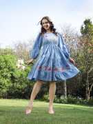 Solid pista green embroidered midi dress. Dress has round neck and long puffed sleeves. Pure cotton breathable summer special fabric. Colourfull resham embroidered dress. Dress Length- 40" Inch.