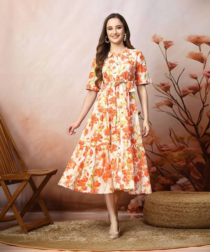 Orange floral printed calf length dress in cotton fabric. It has shirt collar, tie-up belt and half sleeves. Dress length -47'' Inch. Wear it will casual shoes for cool and comfy look.