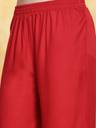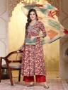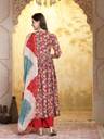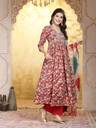 Red Printed flared kurta with beautiful embroidered Alia cut yoke. Solid rayon bottom has fully elasticated belt. Paired with chiffon shaded dupatta with gota detailing. Kurta Length- 47" Inch, Pant Length - 38'' Inch, Dupatta Length - 2.30 mtr.