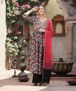 Printed flared kurta with beautiful embroidered Alia cut yoke. Solid rayon bottom with chiffon shaded dupatta