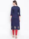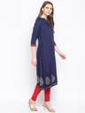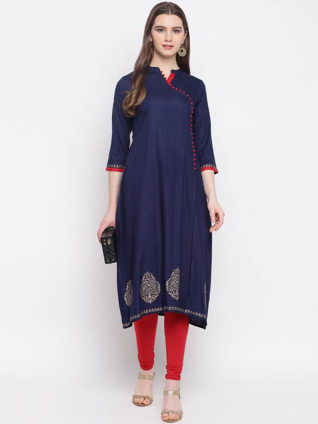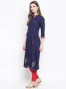 Welcome 2020's occasions and official meetings with this rayon gold print front slit Kurta. Designed as a a-line kurta for the most cool and comfortable fit. Dark blue with contrast bright golden print gives a chic finish to the beautiful Kurta. Carry it all day long from home sweet home to festives and occasions. Can be wear with contrast leggings, palazzos and pants. As well as it looks cool without bottoms too. This hand picked dress is all the way an effort to make a women feel at cloud9. Please pick your size carefully (measurement in inches has been provided in size chart).