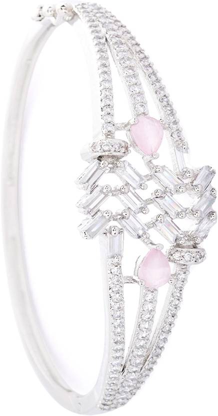 Zigzag Elegance Design: A sleek and modern STYOLLO Bracelet showcasing a structured zigzag Amercian Diamonds with baguette-cut crystals, flanked by vibrant Pink teardrop stones. This piece blends geometric precision with a pop of color for a chic, contemporary look.