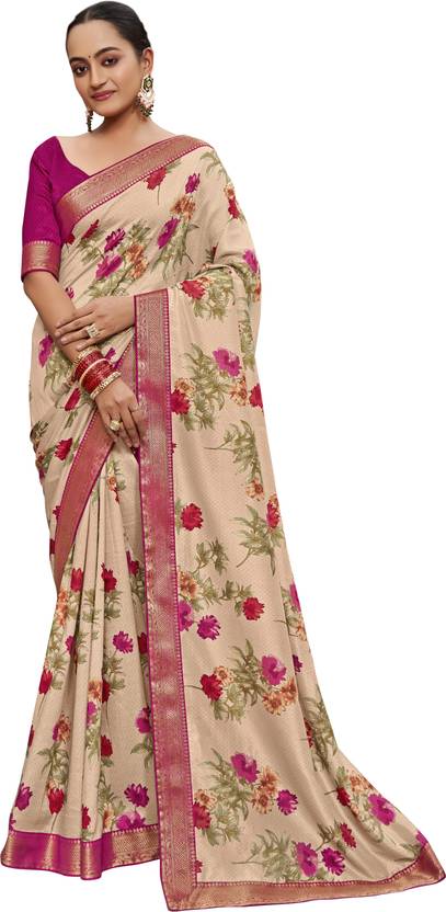 The simplicity and versatility of this Saree will amp up your enthic look lightweight Beige Flower printed Saree with beautiful lace and Pink blouse piece easy for daily as well as occasional wear made by Subhash Sarees. Pair this saree with heels or flats for a graceful look. The each piece of subhash sarees is elegantly crafted and will surely add to your wardrobe.