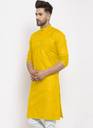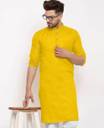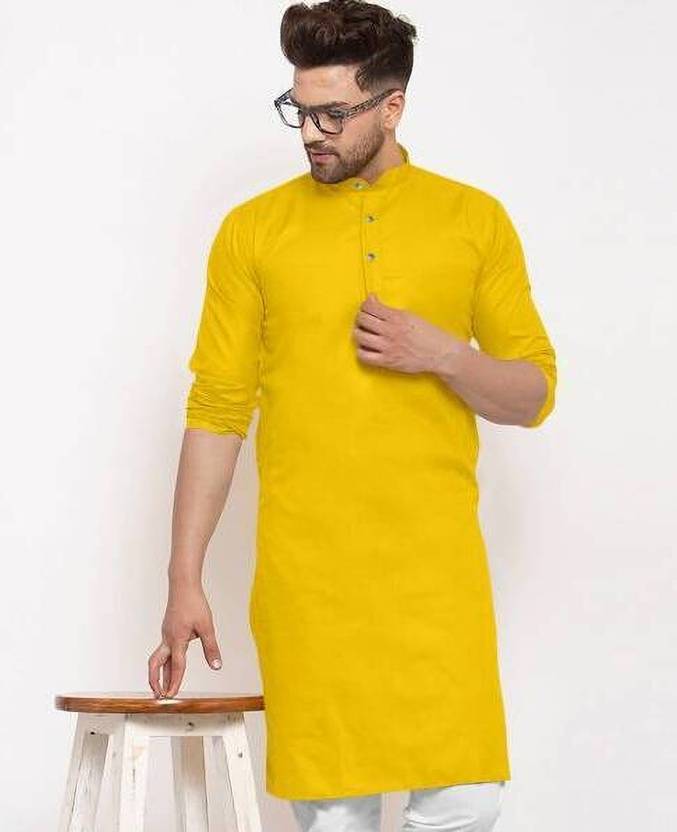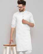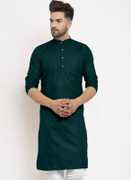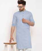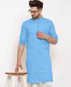 A men's solid kurta is a traditional Indian attire that exudes simplicity and elegance. It is a versatile garment that can be worn for various occasions, ranging from casual gatherings to formal events. The term "solid" refers to the color of the kurta, which is typically a single, uninterrupted shade without any intricate patterns or designs.The solid kurta is typically made from comfortable and breathable fabrics such as cotton, linen, silk, or blends, ensuring a relaxed and airy feel. It is characterized by its straight-cut silhouette, often reaching just above the knee or slightly below, and features a round neckline with a buttoned or slit placket.One of the distinctive features of a solid kurta is its minimalistic design, allowing the focus to remain on the color and fabric texture. This makes it a versatile piece of clothing that can be accessorized in various ways to achieve different looks. Men can pair a solid kurta with contrasting or complementary churidar pants, Aligarh pants, or even straight-cut trousers for a modern twist.Solid kurtas are often chosen in classic colors such as white, beige, black, navy blue, or earthy tones like olive green and maroon. However, the color options are virtually limitless, enabling individuals to select shades that resonate with their personal style and the occasion they are dressing for.For a casual look, a solid kurta can be worn with minimalistic footwear like sandals or slip-ons, along with subtle accessories like a wristwatch or a simple bracelet. On the other hand, to create a more formal appearance, it can be paired with embroidered footwear like mojaris, accessorized with a brooch or a pocket square, and complemented by a well-fitted blazer or Nehru jacket.In summary, a men's solid kurta is a classic and timeless piece of clothing that combines traditional aesthetics with contemporary versatility. Its understated elegance and wide range of styling possibilities make it an essential addition to any gentleman's wardrobe, suitable for both cultural celebrations and modern-day fashion statements.