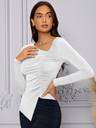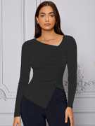 Women's & Girl's Polyester Regular Fit Long Sleeve Asymmetrical Neck Solid Color Ruched Front Asymmetrical Hem Tee Workwear Fancy Top T-Shirt