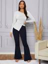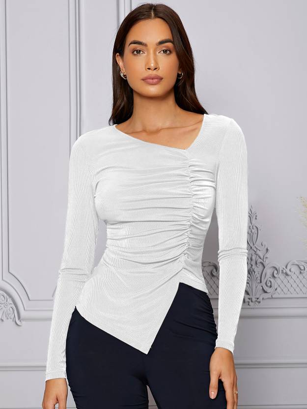 Fit Type: Slim Fit, Fabric: Slight Stretch, Material: Fabric, Composition: 95% Polyester, 5% Elastane, Care Instructions: Machine wash or professional dry clean, Sheer: No.Style: Casual, Pattern Type: Plain, Neckline: Asymmetrical Neck.Details: Asymmetrical, Ruched, Sleeve Length: Long Sleeve, Sleeve Type: Regular Sleeve