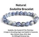 Sodalite Stone Bracelet:Its soothing energy helps to ease stress, promote emotional balance, and create a harmonious atmosphere. Versatile Style: Beyond its metaphysical benefits, the Sodalite Stone Bracelet seamlessly integrates into your style. Whether for daily wear or special occasions, it adds a touch of serene elegance to your ensemble. Intuition and Focus: Sodalite is believed to enhance intuition and mental focus. Embrace the supportive energy of this bracelet as you navigate challenges and make decisions with clarity and insight. Thoughtful Gift: Share the calming and communicative energies of Sodalite with loved ones. This bracelet makes for a thoughtful and meaningful gift, especially for those seeking balance and wisdom. Adorn your wrist with the soothing essence of Sodalite—a symbol of clear communication, inner wisdom, and tranquil energy. Note: The Sodalite Stone Bracelet is a natural product, and variations in color and pattern may occur. Its perceived energetic properties are often rooted in metaphysical beliefs. Enhance Communication and Inner Wisdom. Adorn your wrist with the serene energies of our Sodalite Stone Bracelet—a stylish accessory crafted with genuine Sodalite gemstones known for their association with communication, inner wisdom, and calming vibrations. Communication Enhancement: Sodalite is renowned for promoting clear and effective communication. Wear this bracelet to enhance your ability to express yourself with clarity, compassion, and authenticity. Inner Wisdom: Sodalite resonates with the third eye chakra, facilitating inner wisdom, intuition, and heightened awareness. Let this bracelet be a companion on your journey of self-discovery and spiritual growth. Rich Blue Hues: The bracelet showcases the rich and calming blue hues of Sodalite, creating a visually appealing and versatile accessory. Calm and Soothing Energy: Experience a sense of calm and tranquility as you wear the Sodalite Stone Bracelet.