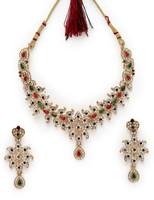 Boasting a delightful jewel set comprising a necklace and earrings, this jewel set radiates sophistication and charm on many occasions wherever you go. You can experience a burst of charm with this stone collar bone necklace and earring jewellery set, a dazzling ensemble designed to stand out at various events. Also, this jewel set showcases beautiful, vibrant stones intricately set in a radiant gold plating, that creates a mesmerising and playful display of hues.