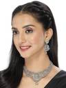 This set of earrings and a necklace made of rhodium silver is ideal for amplifying your beauty at engagements and weddings. The expertly crafted collarbone necklace highlights your neckline with its glossy finish and brilliant AD stones set in luminous silver. The matching earrings finish the look off with style and elegance. This set is suitable for those who want sophistication with a dash of ethnic charm because it radiates both contemporary appeal and classic elegance.