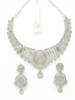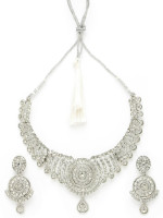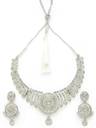 This set of rhodium silver jewellery boasts of its adaptable glamour, with styling options for any event, including weddings and joyous celebrations. The beautiful shape of the earrings and the necklace's collarbone length make them the ideal statement items that will subtly boost any look. This set, precisely constructed and flawlessly completed, radiates sophistication and refinement and will make you look amazing at any special event.