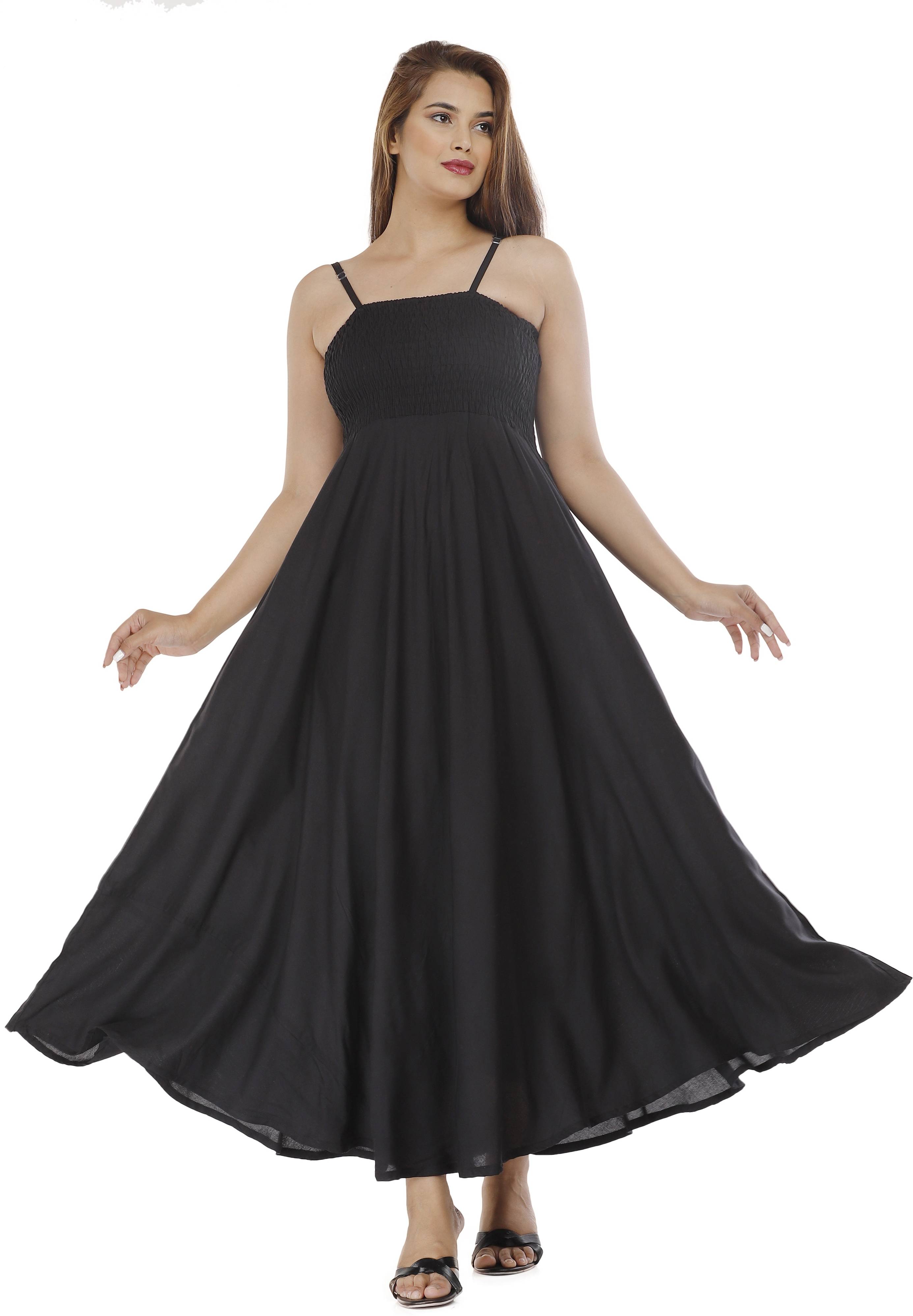 Solid A-line flared Sleeveless Gown has Smoking in its yolk, shoulder straps and Flared Hem. This beautiful dress gives a graceful and stylish look to fetch you compliment . It Is stretchable and comfortable.