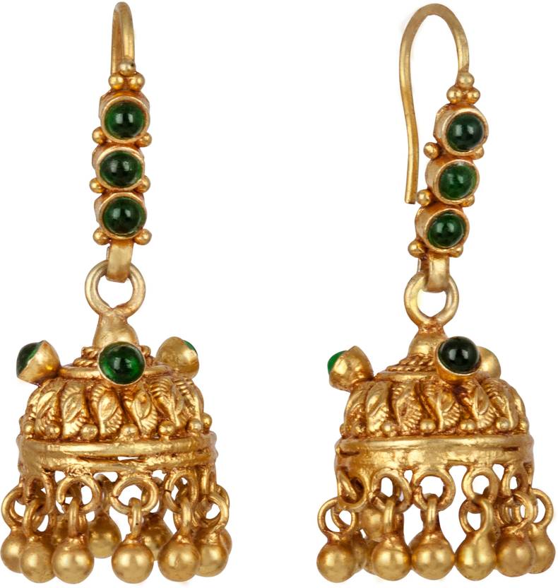 An essence of ultra feminine appeal is rendered by these vintage jhumkas. A set of three synthetic Emeralds at the top are lending a contemporary touch to this traditional piece. Click to grab them now!