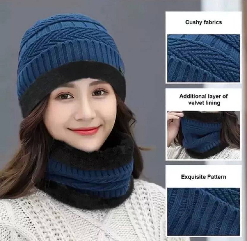 Winter Woolen Beanie Cap Scarf set (Fur Inside) cap for men and women Stretch Warm Winter Cap